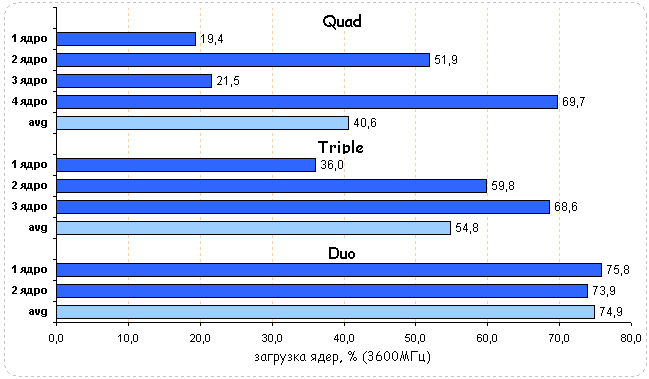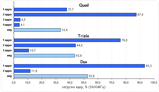 По диаграммам загрузки процессоров видно, что игра X3: Terrain Conflict оптимизирована под двухъядерные процессоры. Средняя загрузка квада составила 33,4%, трехъядерного процессора - 43,6% и двухъядерного - 52,6%.