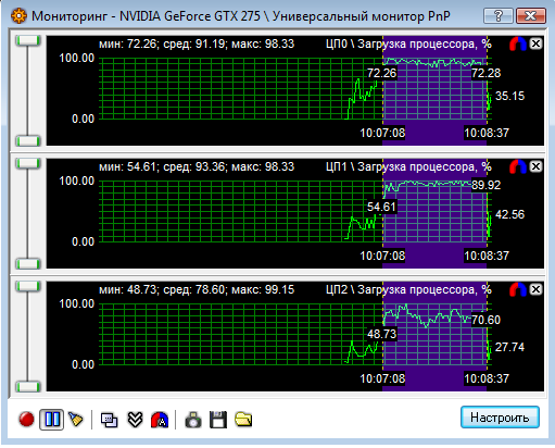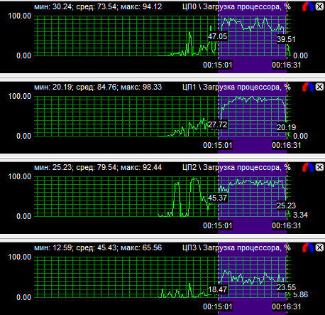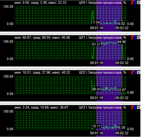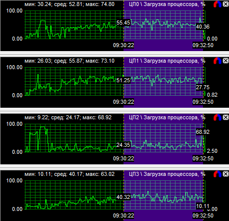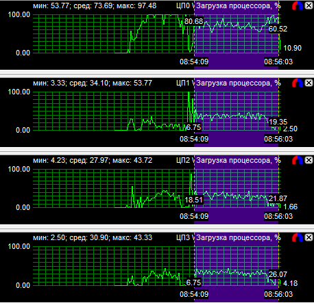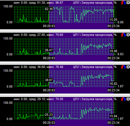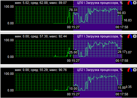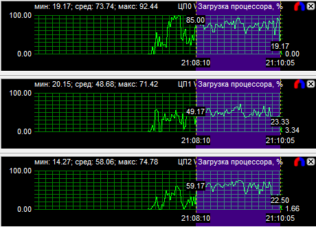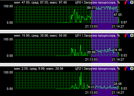 Судя по диаграммам, все процессорные ядра у тестируемых CPU загружены, но неравномерно. Средняя загрузка четырехъядерного процессора составила 41,7%, трехъядерного - 60,2% и двухъядерного - 76,9%. Есть вероятность того, что на более низких частотах нагрузка на процессоры возрастет, и система будет показывать разную производительность в зависимости от установленного в нее типа CPU.
