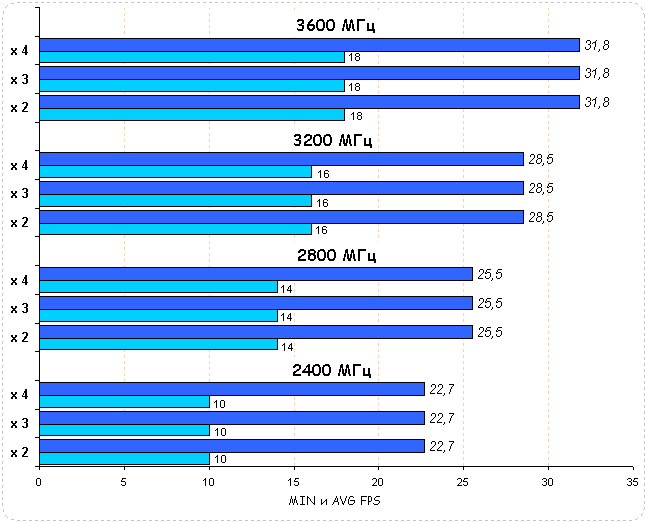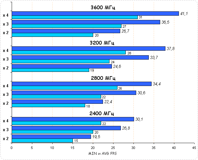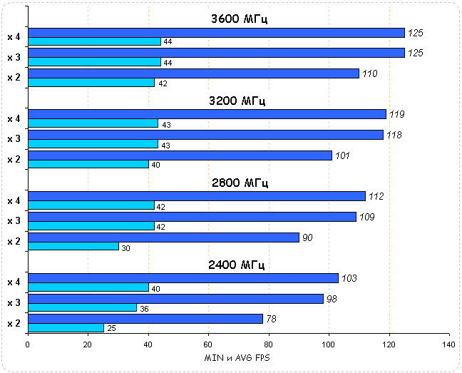 С лучшей стороны проявил себя трехъядерный процессор, он незначительно отстал от квада на малых частотах, а с их ростом сумел догнать старший CPU. На минимальной частоте этот процессор сумел показать сопоставимую производительность с двухъядерным CPU, функционирующим на частоте 3200 МГц.