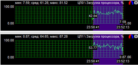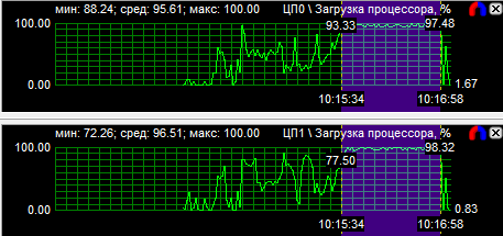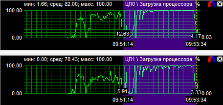 Что примечательно, с ростом тактовых частот нагрузка на процессоры практически не уменьшается. Это ведет к тому, что повышение частоты CPU ведет к почти линейному росту производительности системы. Разгон процессора на 50% дает дивиденды: