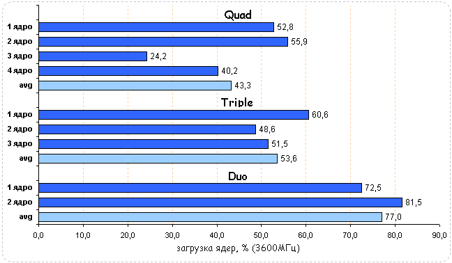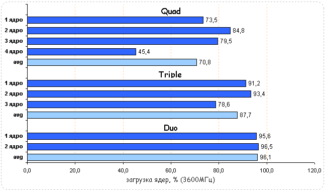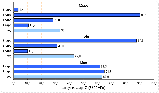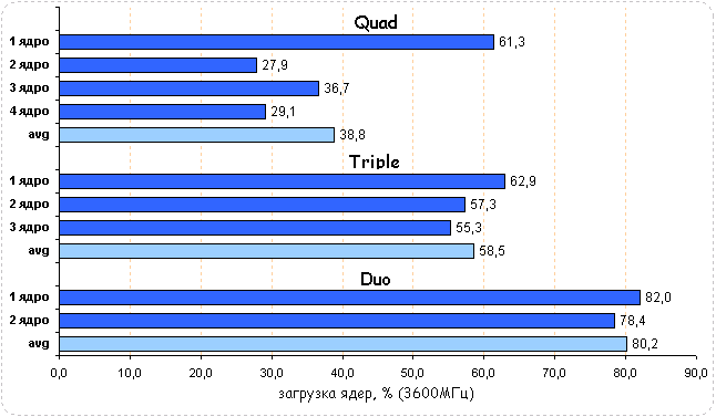 Grand Theft Auto 4 продемонстрировала большую загрузку ядер у всех процессоров. Средняя загрузка четырехъядерного процессора равна 70,8%, трехъядерного - 87,7% и двухъядерного - 96,1%. Высокая степень загрузки процессоров работающих на частоте 3600 МГц говорит о том, что игра процессорозависима и производительность системы будет зависеть как от типа процессоров, установленных в ней, так и от тактовой частоты CPU.
