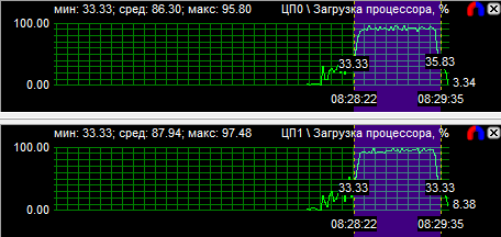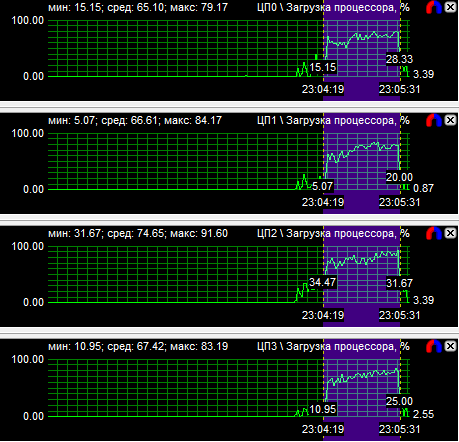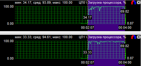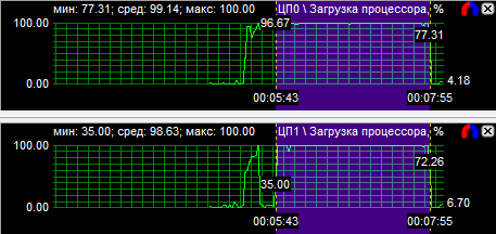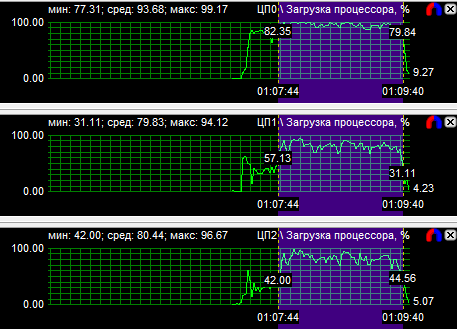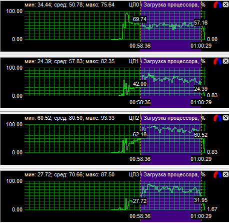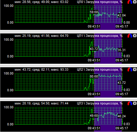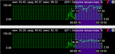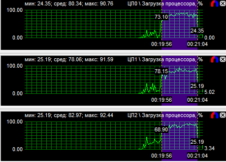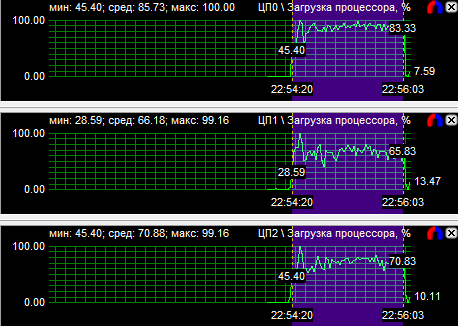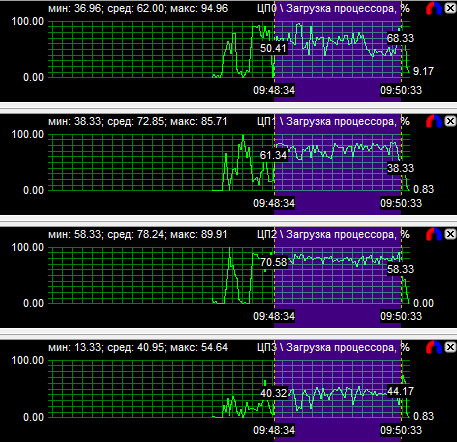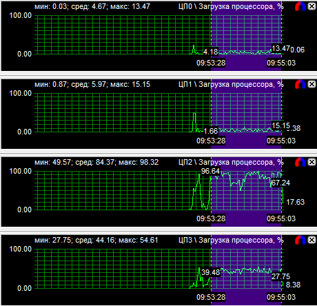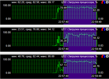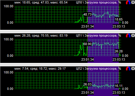 Диаграммы нагрузки процессоров показали, что все CPU загружены равномерно, если не брать во внимание одно максимально нагруженное ядро у трех- и четырехъядерного процессоров. Средняя загрузка квада равна 56,8%, трехъядерного CPU - 74,3% и двухъядерного - 94,3%. Перегруженность двухъядерного процессора даже на максимальной частоте говорит о том, что на меньших частотах он будет уступать конкурентам.