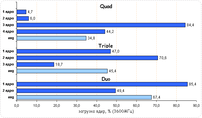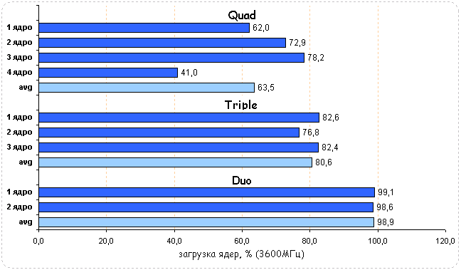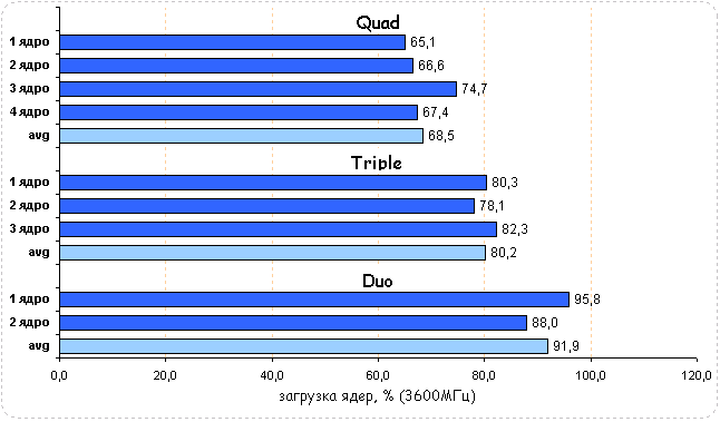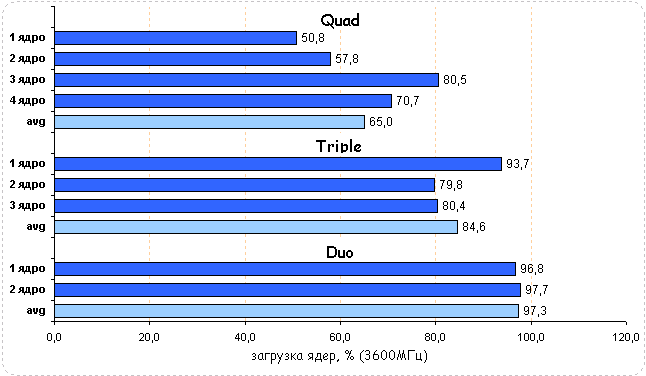 Тестирование показало, что трех- и четырехъядерный процессоры обладают неоспоримым преимуществом перед двухъядерным CPU - уже при частоте 2800 МГц они показывают равную производительность с младшим собратом, работающим на частоте 3600 МГц.