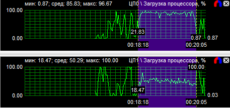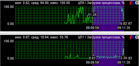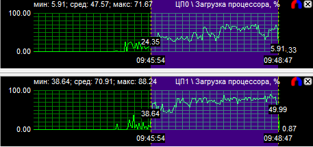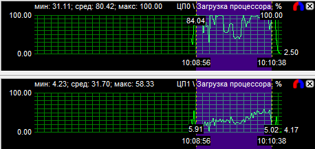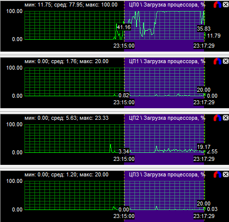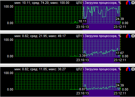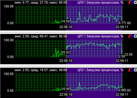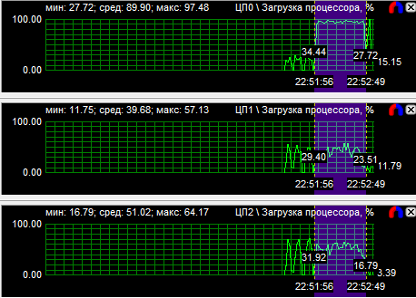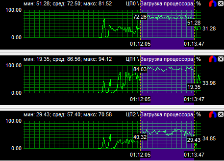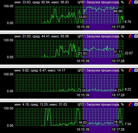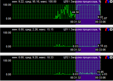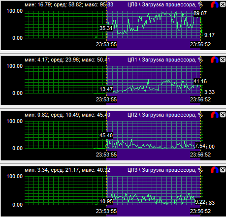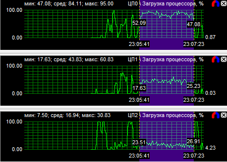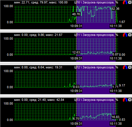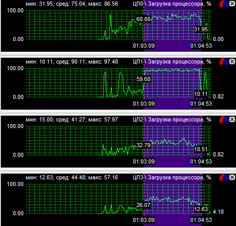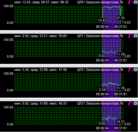 График загрузки процессоров показал, что в PT Boats: Knights of the sea ядра у всех протестированных CPU нагружены неравномерно, причем во всех случаях одно нагружено значительно больше других. Это говорит о том, что игра, скорее всего, оптимизирована под двухъядерные процессоры. Средняя загрузка четырехъядерного процессора равна 28,6%, трехъядерного - 38,9% и двухъядерного - 59,3%.