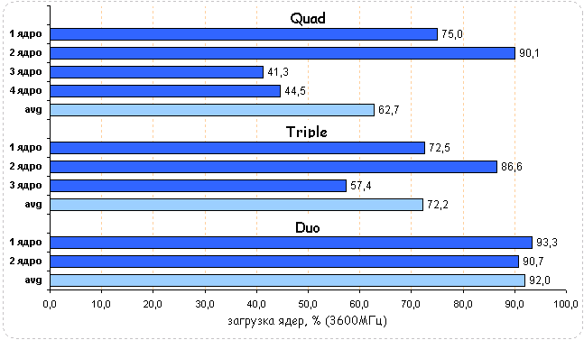 Несмотря на солидный возраст этого проекта, игра STALKER, в частности аддон STALKER: Clear Sky, так и не была оптимизирована под многоядерные процессоры. Диаграммы загрузки CPU показали, что во всех случаях нагружено только одно ядро. Средняя загрузка четырехъядерного процессора составила 21,7%, трехъядерного - 35,6% и двухъядерного - 52,7. Незначительная загрузка процессоров указывает на то, что с понижением частот она не возрастет настолько, чтобы снизить производительность системы.