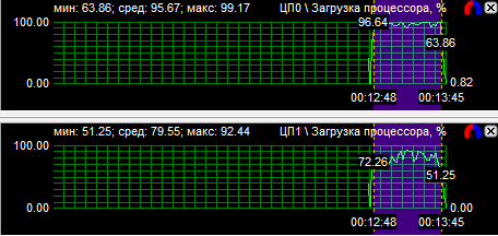 Графики загрузки ядер показали, что у всех тестируемых процессоров они нагружены, хоть и неравномерно. У трех- и четырехъядерного CPU больше других нагружены два ядра, но по этим данным нельзя утверждать, что игра оптимизирована под двухъядерные процессоры, так как оставшиеся ядра тоже прилично загружены. Средняя загрузка четырехъядерного процессора составляет 62,7%, трехъядерного - 72,2% и двухъядерного - 92%. Столь высокая нагрузка на все процессоры при максимальной частоте говорит о том, что система в игре будет значительно снижать производительность при понижении тактовых частот CPU.