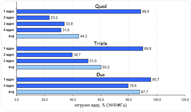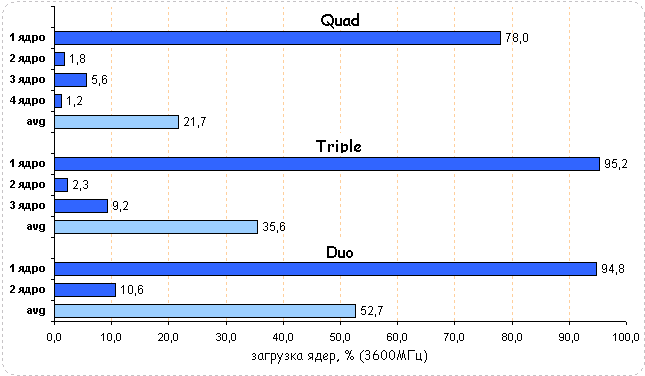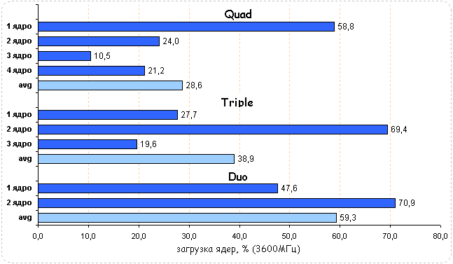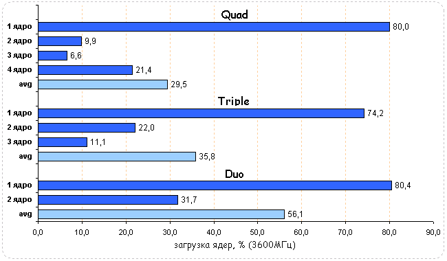 Долгие годы среди пользователей бытовало мнение, что Supreme Commander оптимизирован под многоядерные процессоры и производительность системы хорошо реагирует на тип установленного в ней процессора. Диаграммы загрузки CPU поставили на этом заблуждении жирный крест - во всех случаях ядра загружены неравномерно, плюс одно ядро нагружено значительно больше других. Средняя загрузка квада равна 29,5%, трехъядерного CPU - 35,8% и двухъядерного - 56,1%.