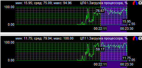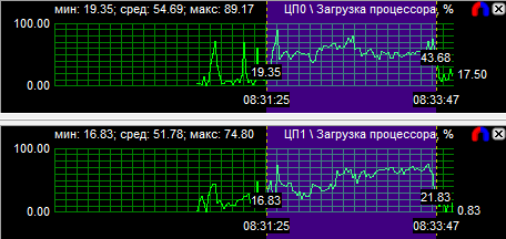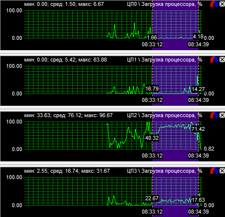 Тесты подтвердили показания диаграмм загрузки процессоров - на всех частотах протестированные CPU показали равную производительность.