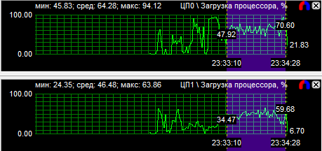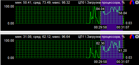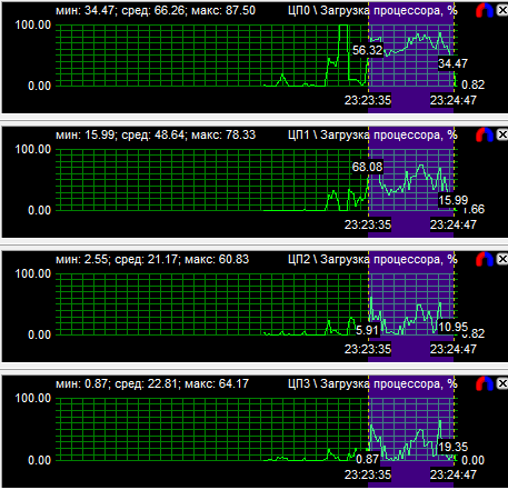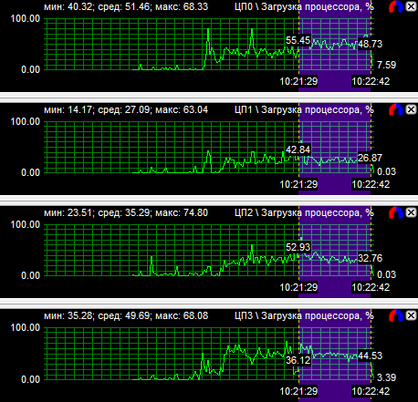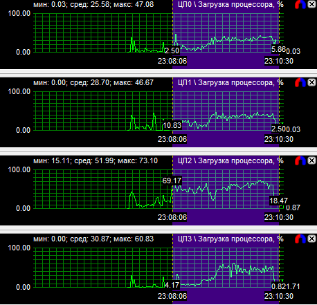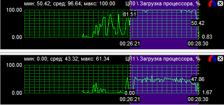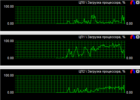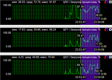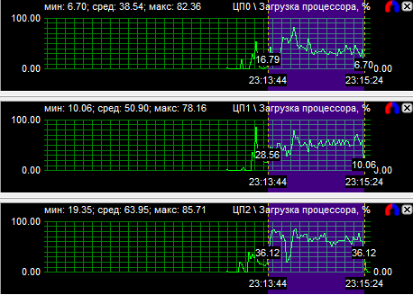 Рассмотрев диаграммы загрузки процессоров, мы видим, что у четырехъядерного процессора загружены все ядра, но неравномерно, большая нагрузка лежит на двух ядрах из четырех. У трехъядерного процессора также неравномерно загружены все ядра, зато двухъядерник может похвастаться равной производительностью своих вычислительных CPU. Средняя загрузка четырехядерного процессора равна 40,9%, трехъядерного - 51,1% и двухъядерного - 77,6%.