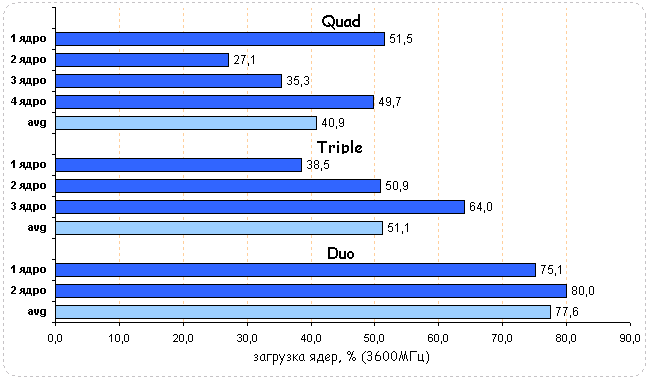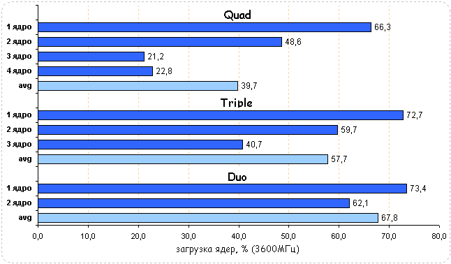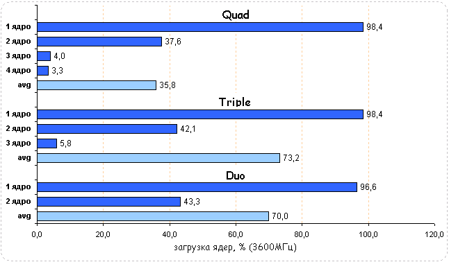 Диаграммы загрузки процессоров показали, что в Tom Clancy: HAWX нагружены все CPU, хотя эта нагрузка носит неравномерный характер. Средняя загрузка квада равна 34,3%, трехъядерного процессора - 42% и двухъядерного - 53,3%. Незначительная нагрузка на процессоры при максимальной частоте говорит о том, что с ее понижением нагрузка на CPU может не измениться и их производительность останется на том же уровне.