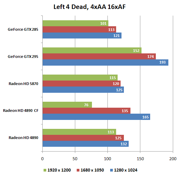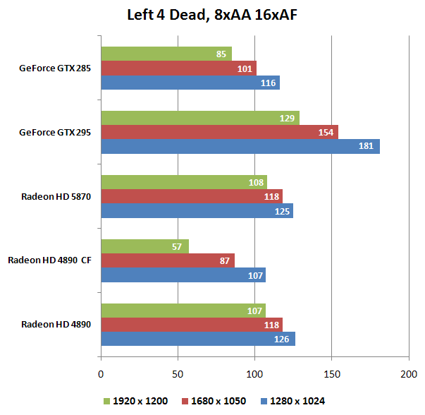 Несовершенство (а точнее сырость и неоптимизированность) единственной доступной нам на момент тестирования версии драйверов, предназначенных для использования с платой HD 5870, периодически давало о себе знать. Так, в Left 4 Dead новый флагман не смог обойти не только GTX 295, но даже HD 4890, и дело тут явно не в "слабом" графическом процессоре: