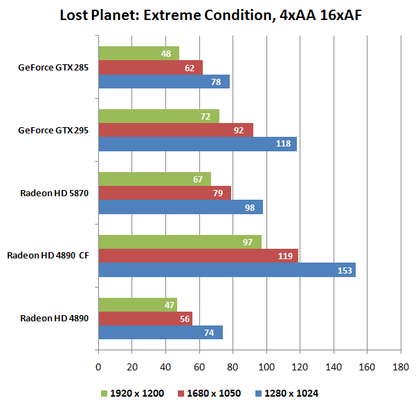 Lost Planet, достаточно требовательная к ресурсам видеокарты игра, позволяет HD 5870 обойти практически всех участников, уступив лидерство лишь CF-связке из двух HD 4890. В разрешении 1920х1200 разница между GTX 285 и HD 5870 почти двукратная: