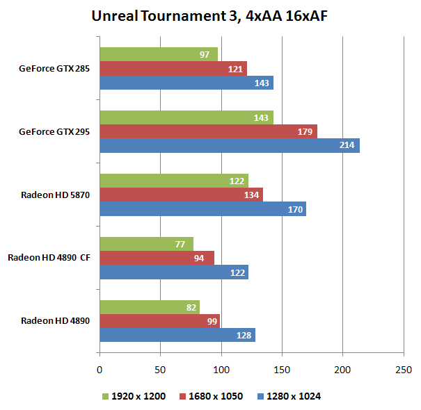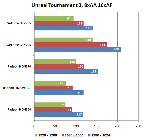 В Unreal Tournament 3 при активации восьмикратного аниалиасинга GTX 295 лидирует, на втором месте HD 5870, на третьем - GTX 285. Таким образом, бывший абсолютный "одночиповый" лидер производства NVIDIA повержен. Одиночная HD 4890 и CF-связка (здесь явно проблема с драйверами) отстают с приличным отрывом.