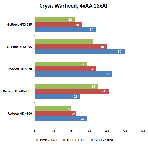 Crysis Warhead наглядно показывает, что HD 5870 хорош в тяжелых режимах и высоких разрешениях: в 1280 х 1024 разница между ним и GTX 295 составляет 12%, а в 1920 х 1200 сходит на нет. CF HD 4890 выявляют очередной глюк в драйверах - самый низкий показатель в 1280 х 1024.