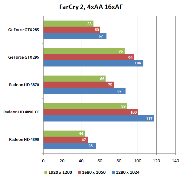 В FarCry 2 ситуация повторяется: HD 5870 идет почти вровень с GTX 295 в высоких разрешениях, в низких - проигрывает.
