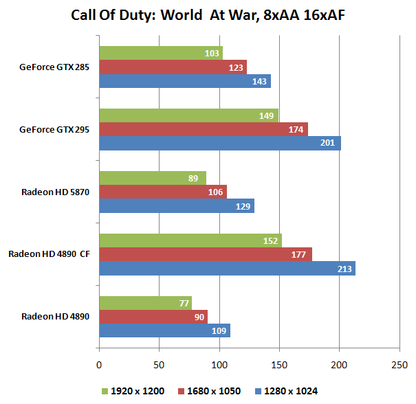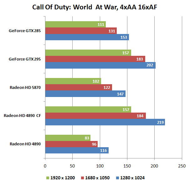 В Call of Duty независимо от режима лидирует CF-связка, за ней - GTX 295, на третьем месте - одночиповая GTX 285, замыкают список HD 5870 и HD 4890. Разница в производительности между аутсайдерами теста невелика и не соответствует теоретическим возможностям HD 5870, будем надеяться, что в следующих версиях драйверов ситуация изменится к лучшему.