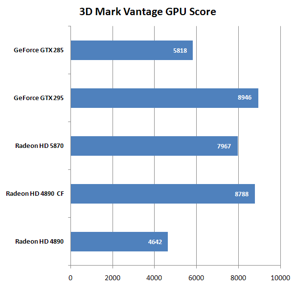 HD 5870 в 3D Mark Vantage по очкам обходит GTX 295, лишь немного уступая CF HD 4890. Можете себе представить, каких результатов можно получить с двумя такими видеоадаптерами? Но об этом в будущих статьях.