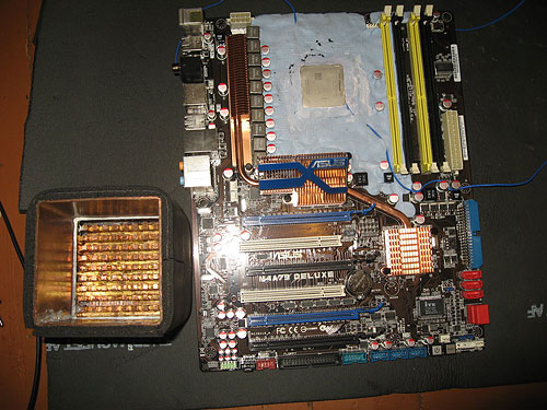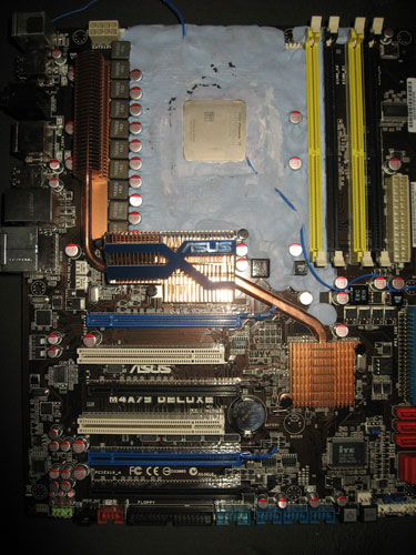Для успешного разгона необходима соответствующая изоляция системы от конденсата. Дальновидный капитан GraduS готовит материнскую плату к рекордам, используя BLU TACK. Заизолировано всё околосокетное пространство, начиная от питания процессора и до слотов памяти и PCI-E слота. Не забыта и обратная сторона платы, при -196С на процессоре промерзает всё вокруг – изоляции мало не бывает.