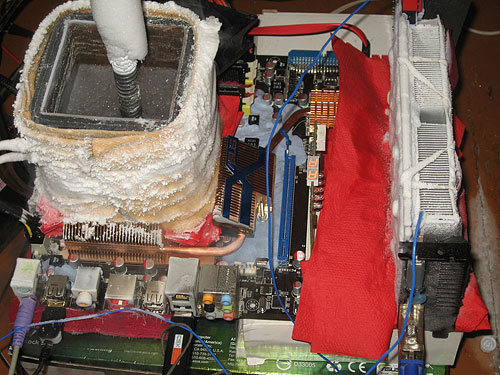 Тряпки промокли и промерзли, что подтолкнуло Евгения, гонявшего уже не один год на всяких фреонах и азотах, задуматься о лучшей изоляции, а также ему не давали покоя мысли и о лучшем охлаждение ядер видеокарты.