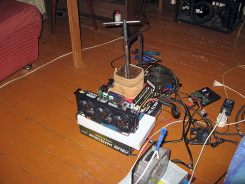 На стандартном охлаждении карта погналась весьма уныло для топовых результатов. В связи с отсутствием нормальных стаканов, для карты был сделан стакан из родного охлаждения. Оригинальное гетто-решение нашей команды. Для принятия азотных ванн карта была облеплена все тем же BLU TACK для изоляции от конденсата. Опять же, как и в случае с материнской платой, была щедро залеплена обратная сторона видеокарты.