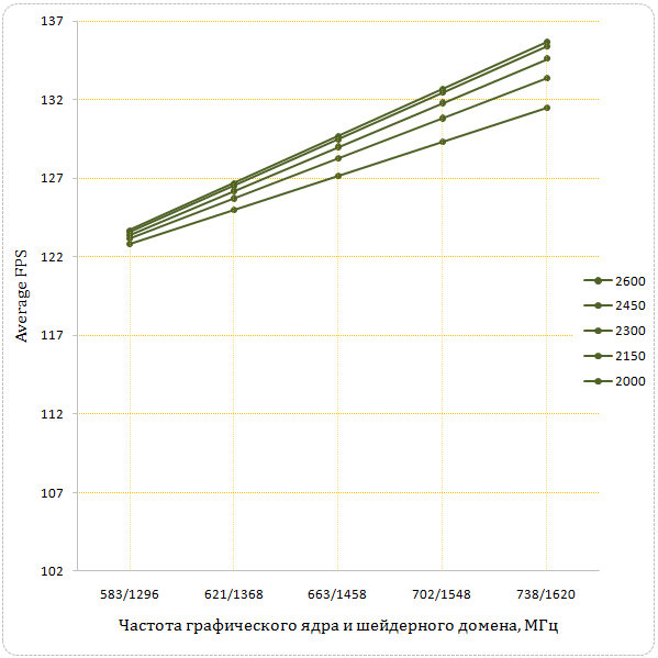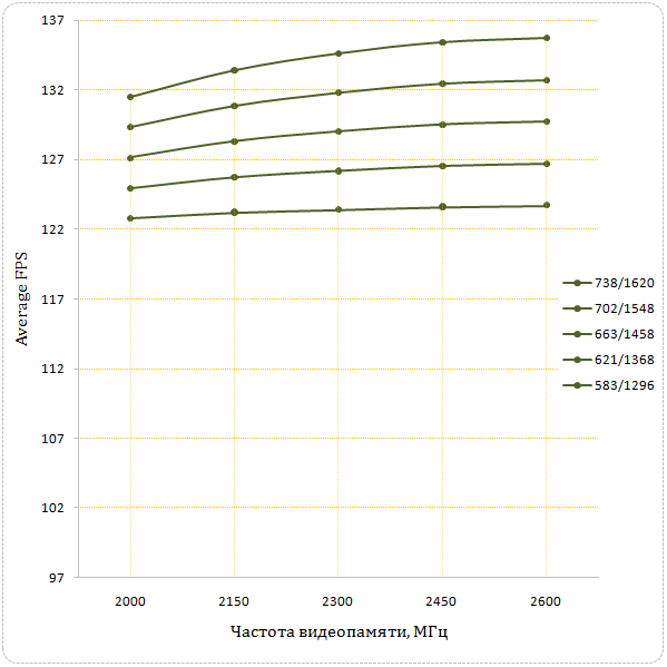 Разгон видеопамяти дает смехотворный прирост производительности видеокарты при частоте графического ядра/шейдерного домена 583/1296 - всего 0.7%. Дальнейшее повышение частоты GDDR ведет к незначительному росту avg fps, при частоте 2600 МГц его величина составила 3.2%. Характерно, что уже после частоты видеопамяти 2300 МГц производительность почти не растет.
