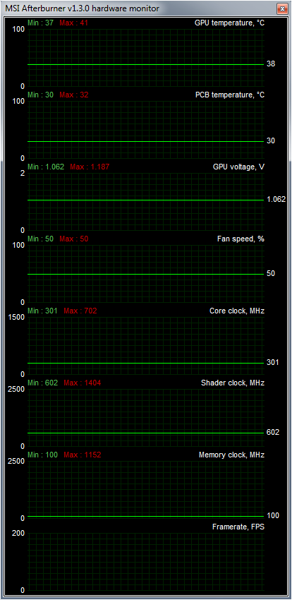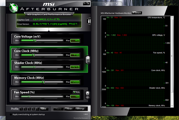Главная панель утилиты MSI Afterburner разбита на две части. В левой части расположены ползунки изменения напряжения и частоты графического ядра, частот шейдерного домена и видеопамяти, оборотов кулера видеокарты. В правой части находится панель мониторинга параметров видеокарты.