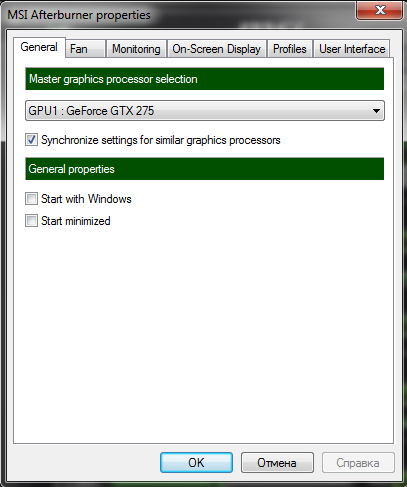 В закладке "General" можно выбрать видеокарту, если в систему их установлено две или больше, синхронизировать настройки и частоты видеокарт, задать старт утилиты вместе с загрузкой операционной системы и минимизировать утилиту.