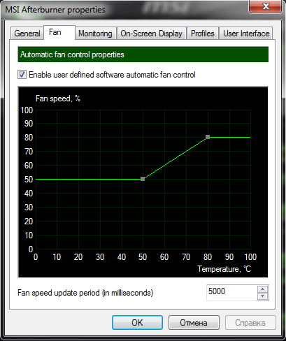 Закладка "Fan" также активируется кнопкой "User Deline", расположенной на главной панели утилиты. В этой закладке можно настроить автоматическую регулировку оборотов кулера видеокарты, в зависимости от ее температуры. Это делается элементарным перетаскиванием мышью узловых точек графика. Также можно задать период мониторинга скорости вращения вентилятора.