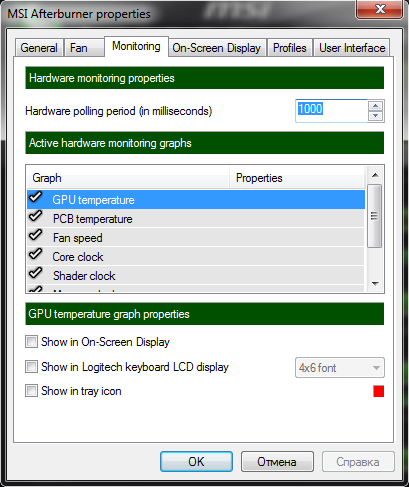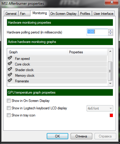 Также в этой закладке настраивается период мониторинга источников, отображение счетчика Framerate в играх (Show in On-Screen Display), трее (Show in tray icon) и ЖК панели клавиатур Logitech (Show in Logitech keyboard LCD display).