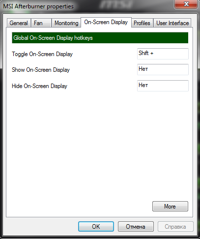 Кнопка "More" открывает окно расширенных настроек "Show in On-Screen Display":
