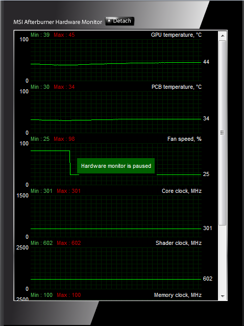 В закладке "Monitoring" можно задать источники: температуры графического ядра (GPU temperature) и РСВ (PCB temperature), частот графического ядра (Core clock), шейдерного домена Shader clock) и видеопамяти (Memory clock), скорости кулера (Fan speed), Framerate.