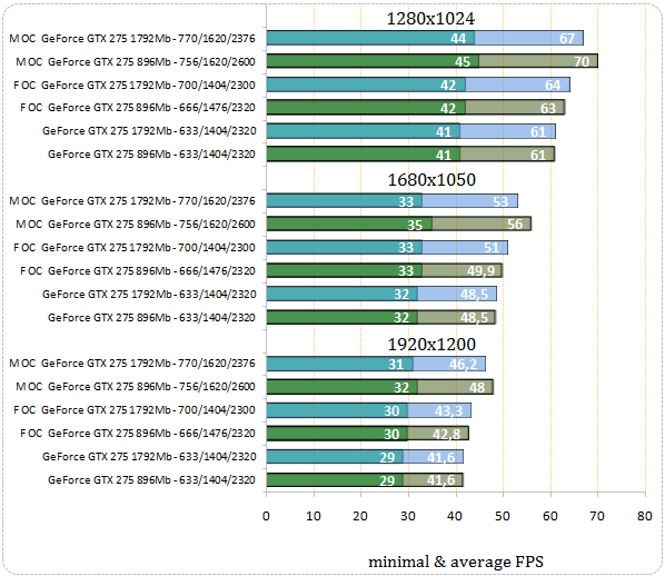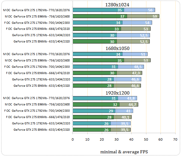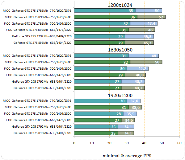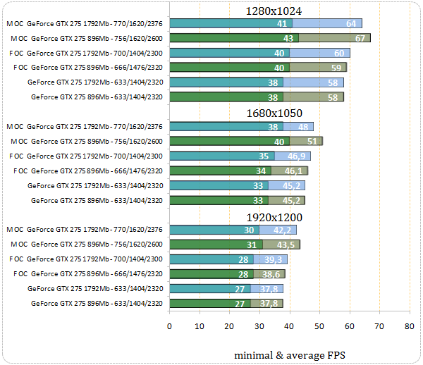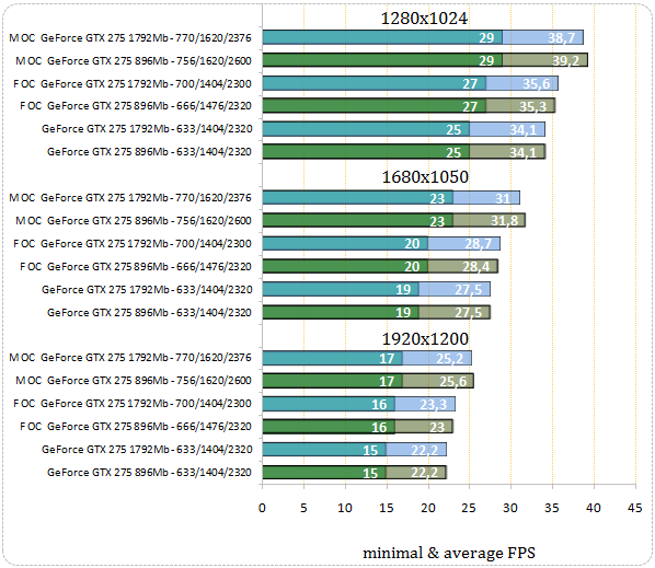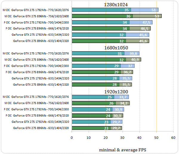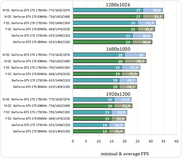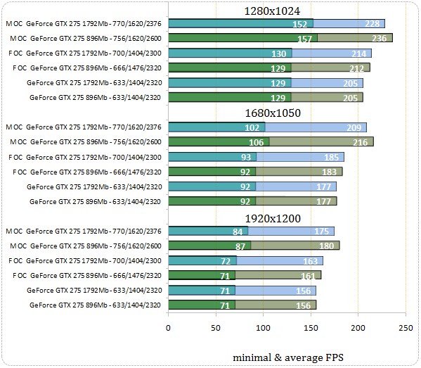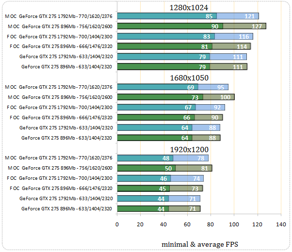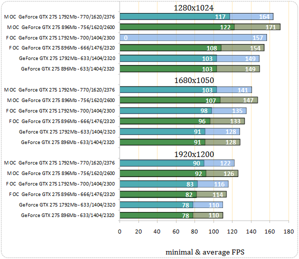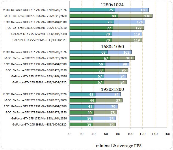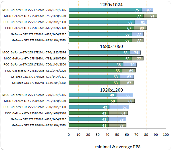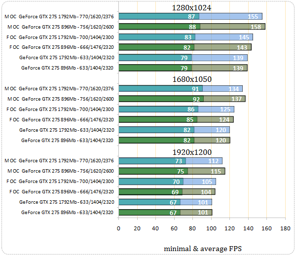 В Call of Duty 4: Modern Warfare мы не зафиксировали рост производительности видеокарты с 1792 Мбайт видеопамяти. При заводских частотах, LIGHTNING оказался не значительно быстрее TWIN FROZR. Однако после максимального разгона он обошел конкурента, в первую очередь за счет лучшего разгонного потенциала видеопамяти.