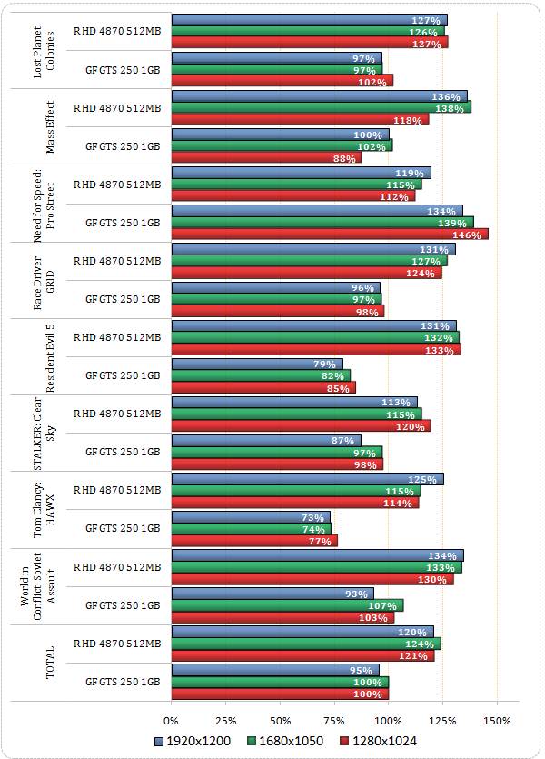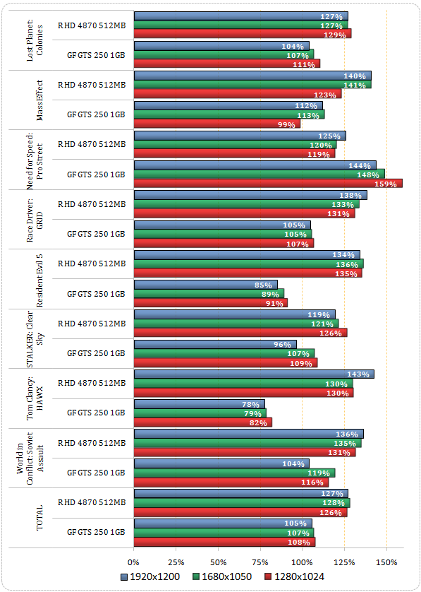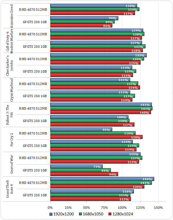 Расклад сил между видеокартами GeForce GTS 250 1024 Мбайт, Radeon HD 4850 1024 Мбайт и Radeon HD 4870 512 Мбайт, работающих в номинальном режиме, в шестнадцати играх, распределяется следующим образом: