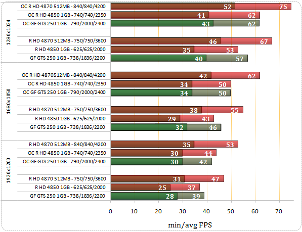 В Far Cry 2 в низком разрешении 1280х1024 лидирует Radeon HD 4870, однако с ростом разрешения на его производительность начинает сказываться малый объем видеопамяти, в результате чего на разрешении 1920х1200 он отстает от конкурентов. В противостоянии GeForce GTS 250 и Radeon HD 4850 уверенно побеждает видеокарта NVIDIA.