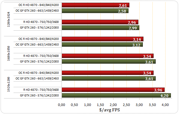Диаграмма соотношения стоимости и производительности GeForce GTХ 260 896 Мбайт и Radeon HD 4870 1024 Мбайт ($/avg fps)