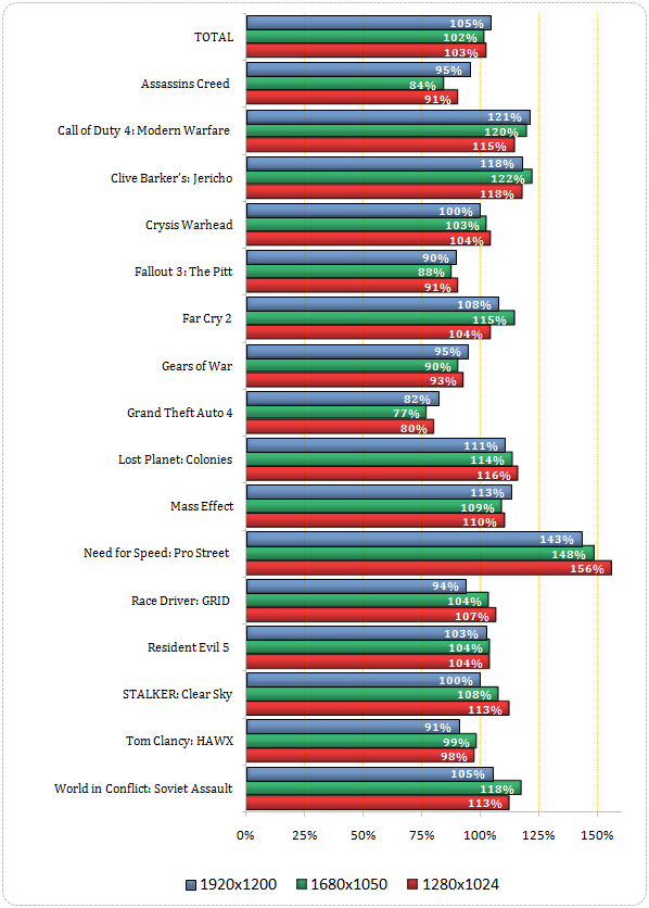 По диаграмме видно, что GeForce GTХ 260 896 Мбайт опережает Radeon HD 4870 1024 Мбайт в разрешениях 1280х1024 и 1680х1050. Только в разрешении 1920х1200 видеокарте AMD(ATI) удалось установить паритет с конкурентом.