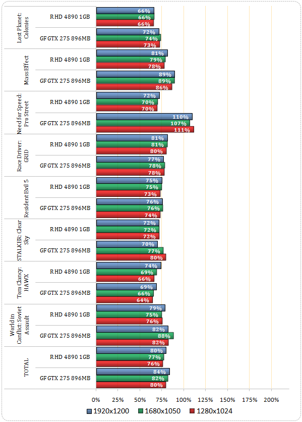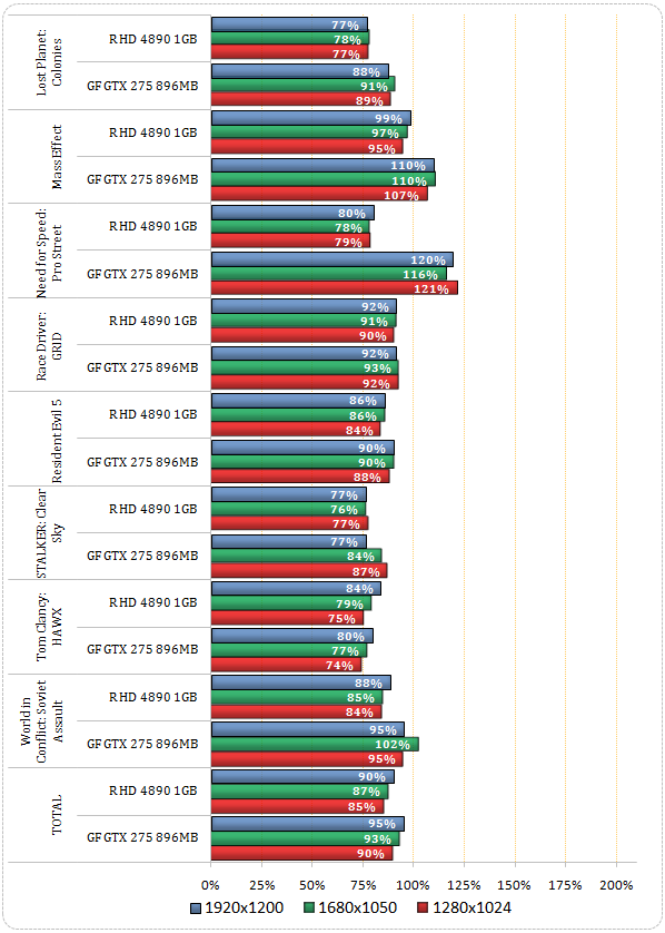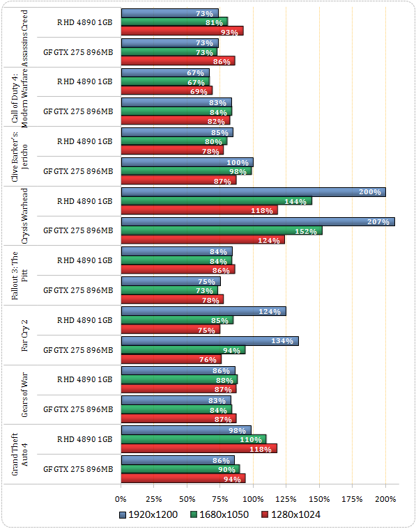 В разрешениях 1280х1024 и 1680х1050 GeForce GTX 275 незначительно быстрее Radeon HD 4890. После повышения разрешения до 1920х1200 производительность этих графических ускорителей сравнялась.