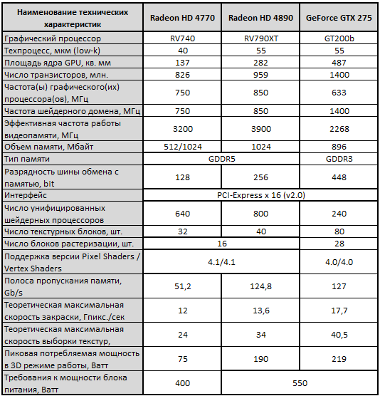 Технические характеристики AMD(ATI) Radeon HD 4770/4890 и NVIDIA GeForce GTX 275