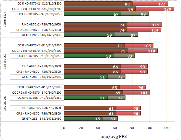 На штатных частотах первое место в Assassins Creed делят Radeon HD 4870x2 и дуэт Radeon HD 4870. После разгона два Radeon HD 4870 захватили лидерство, а GeForce GTX 285 в разрешении 1280х1024 смогла конкурировать с Radeon HD 4870x2. Однако с повышением разрешения ее производительность значительно снизилась, и она отстала от основного конкурента.