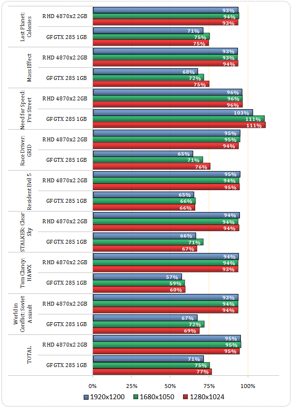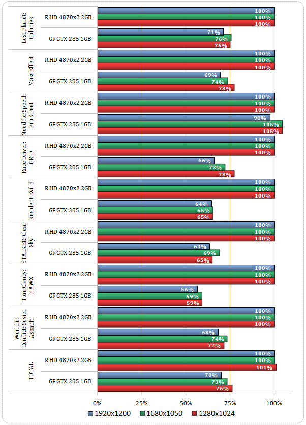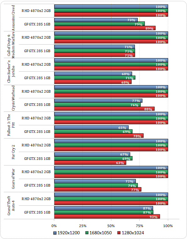 Сводная диаграмма производительности GeForce GTХ 285 1024 Мбайт и Radeon HD 4870x2 2048 Мбайт относительно производительности CrossFireX 2 x Radeon HD 4870 1024 Мбайт, работающих на штатных частотах (за 100% взят результат CrossFireX 2 x Radeon HD 4870 1024 Мбайт)