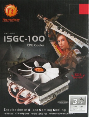 ISGC-100 поставляется в очень компактной картонной коробке, оформление которой выполнено в темных тонах. На рисунке изображена девушка с мечом и непосредственно сам Thermaltake ISGC-100.