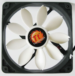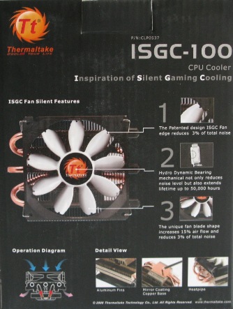 Thermaltake ISGC-100 оснащен 9-лопастным вентилятором TTB992512HS типоразмера 92 мм. По сути, это все тот же ISGC 12 производства компании YS Tech, но поменьше и с небольшими отличиями. Во-первых, этот вентилятор не оснащен встроенным реобасом, а во-вторых его скорость вращения регулируется автоматически с помощью PWM-управления. Официально заявленный уровень шума равен всего 17 дБ, воздушный поток составляет 37 CFM. В основе вентиляторов серии ISGC лежит гидродинамический подшипник со сроком службы около 50000 часов.