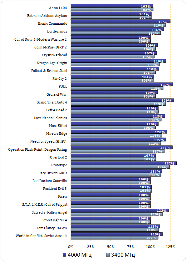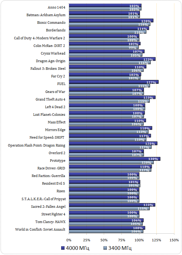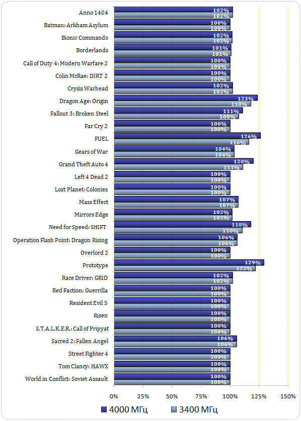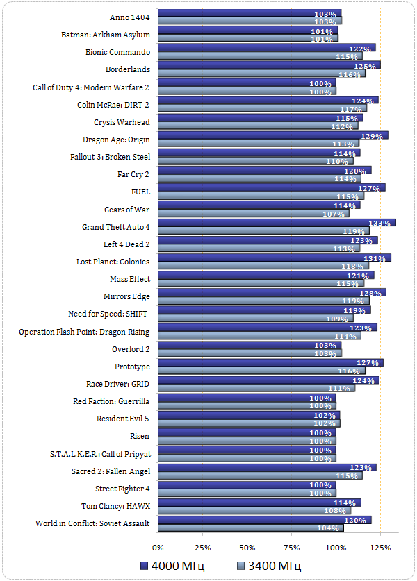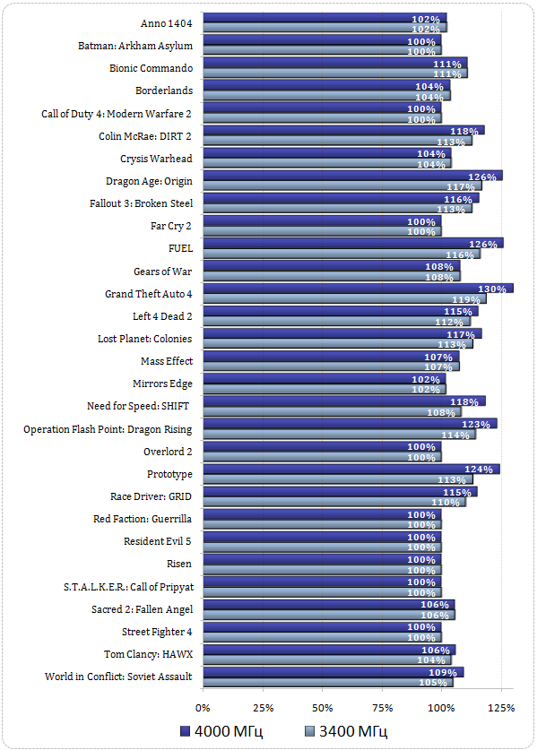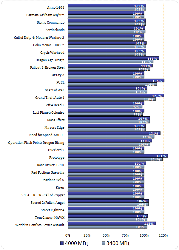 - рост производительности после повышения частоты процессора до 3400 МГц и 4000 МГц - в 12 играх
