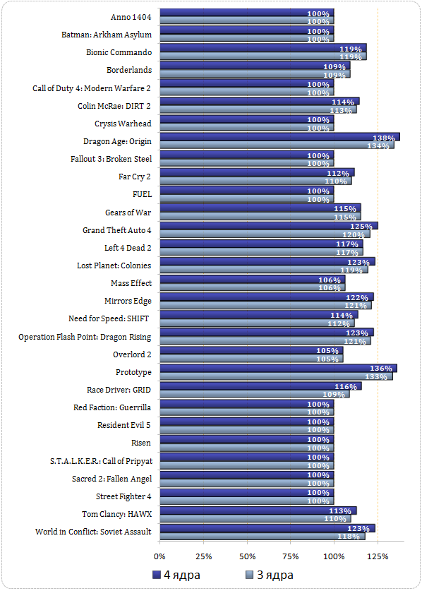 - рост производительности после активации 3-го и 4-го ядер - в 11 играх