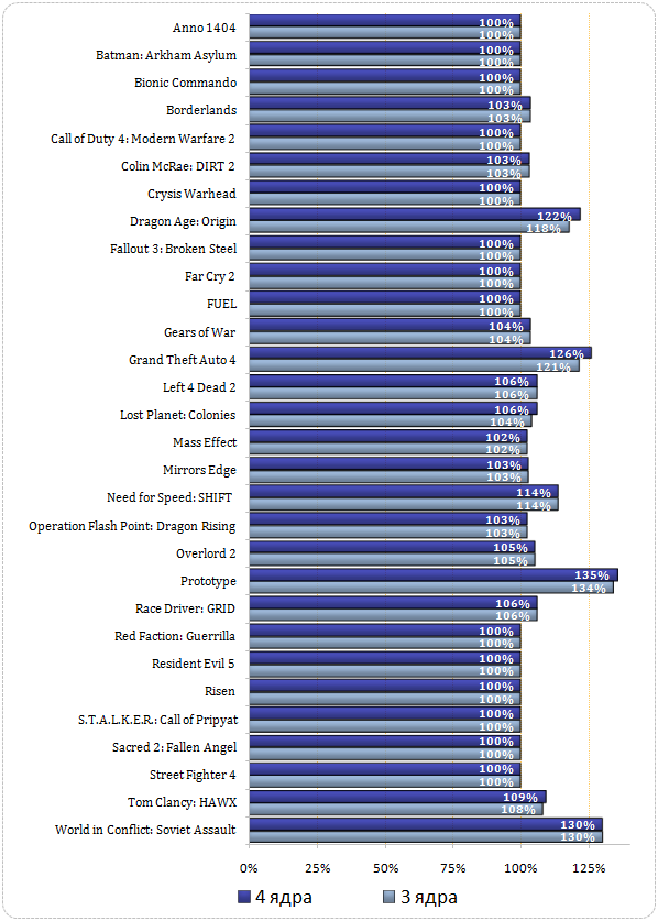 - На малых частотах и в низком разрешении 1280х1024, четырехъядерный процессор производительнее трехъядерного собрата в 26% игр. Но после повышения частоты процессора и разрешения до 1920х1200, доля этих игр сокращается до 10-20%.