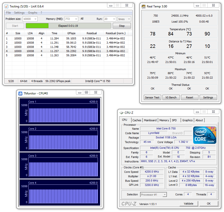 Стендовый экземпляр Core i5 750 под Thermalright IFX-14 начинает ощутимо «греться» в Linpack только при достижении четырехгигагерцевой отметки. Но очень быстро. В результате этот процессор способен работать на 4200 МГц при напряжении 1.4 В.