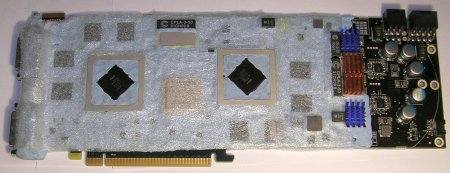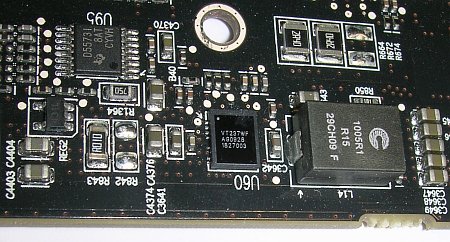 Система питания Radeon HD5970, несмотря на кажущуюся сложность, на самом деле не очень мощная. На каждый графический процессор приходится всего лишь по три фазы питания. Это в несколько раз меньше чем применяется на некоторых нереференсных Radeon HD5870 (например, на MSI R5870 Lightning используется 12-фазная система питания GPU). Это связано с тем, что разместить на одной печатной плате большое количество фаз питания для двух графических процессоров просто негде.