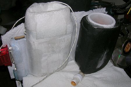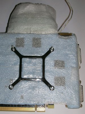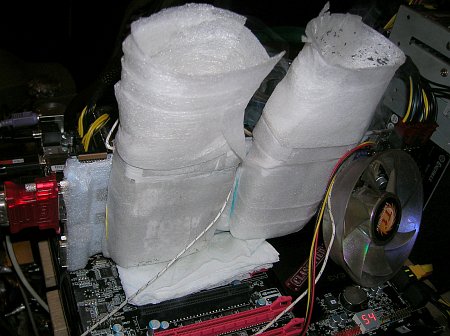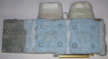 Для защиты от попадания влаги (конденсата) я использовал Bostic BLU-TACK, а в качестве теплоизоляции – самоклеющуюся ленту из пенополиэтилена "Теплолента". Bostic был нанесен по всей поверхности видеокарты, за исключением микросхем и правой части видеокарты, где расположена большая часть элементов системы питания. Микросхемы VT1157SF справа были закрыты радиаторами, а слева - термопрокладкой.