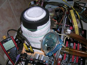 К сожалению, стабильности на этих частотах получить так и не удалось. Чем дольше выполнялся бенчмарк, тем сложнее было удержать температуру на одном из стаканов (на том, который был с дополнительной медной пластиной). Так же возможно повлияло отсутствие cap-mod'а.