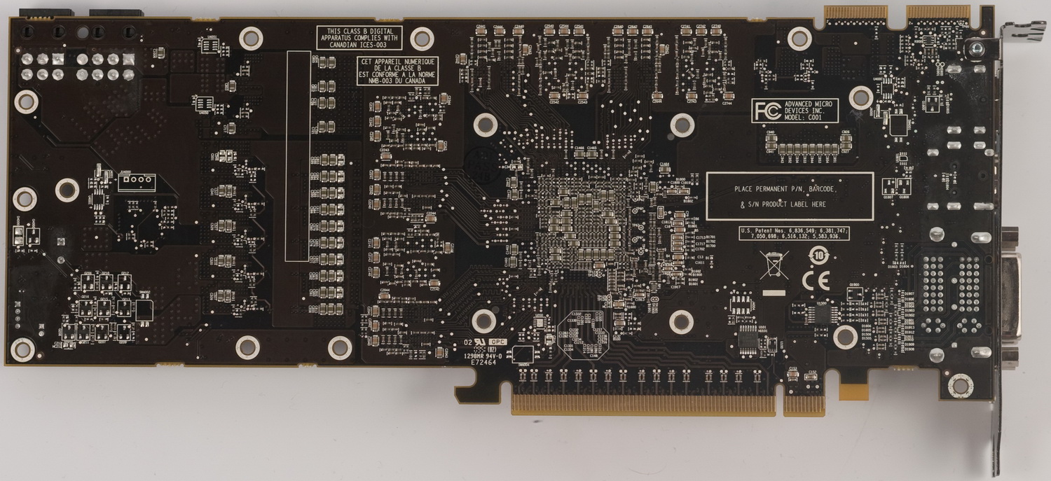 Это «дежавю»? Нет, наши предположения оправдались. Перед нами копия видеокарты Radeon HD 5870, замене подверглись лишь некоторые элементы подсистемы питания. Как мы видим, графический процессор повернут на 45 градусов относительно подложки и окружен металлической рамкой для защиты от сколов. Восемь микросхем памяти Samsung общим объемом 1 Гб функционируют на частоте 4000 МГц. По маркировке микросхем видеопамяти можно узнать о времени выборки равной 0.4 нс, что в свою очередь говорит о возможности функционирования данной памяти на частоте 5000 МГц QDR. Эту теорию мы обязательно проверим, но чуть позже. Разъемы для объединения видеокарт в тандем CrossFireX находятся в привычном месте. Два шестиштырьковых гнезда для подключения дополнительного питания также никуда не делись.